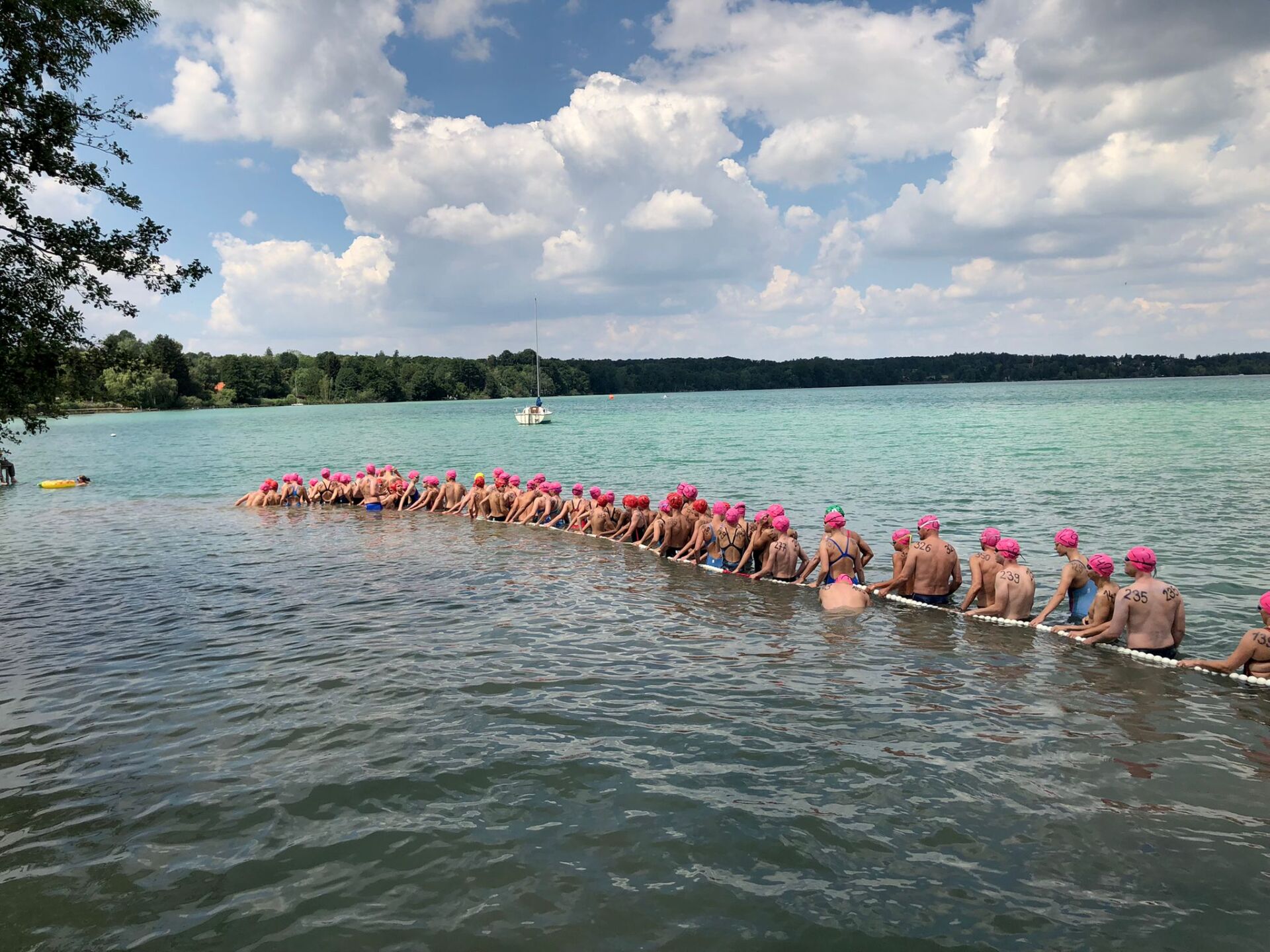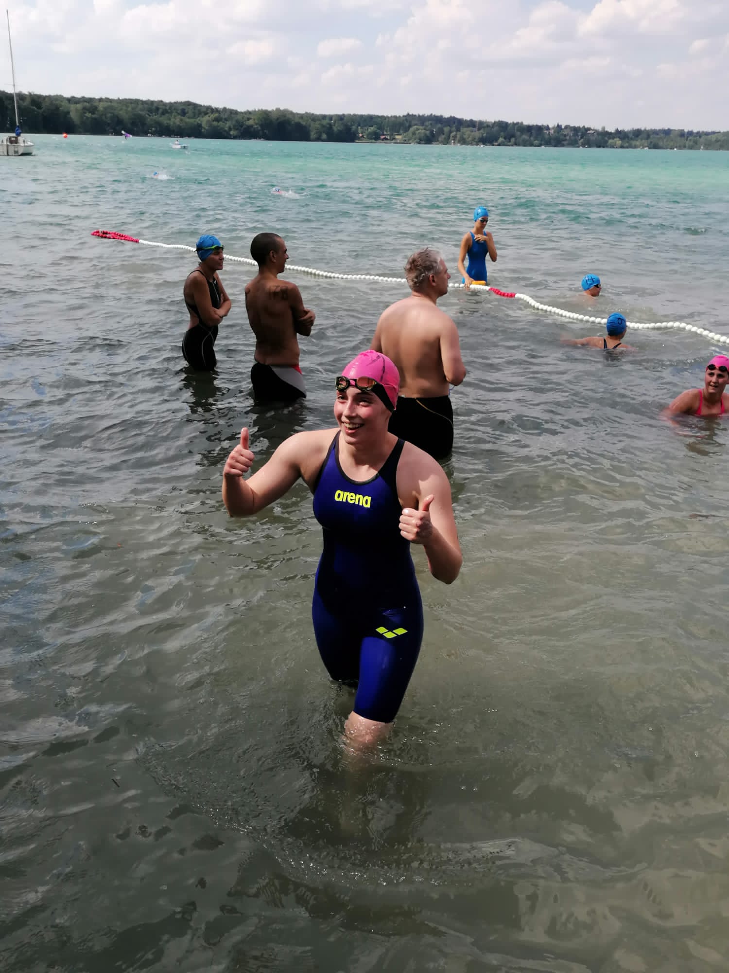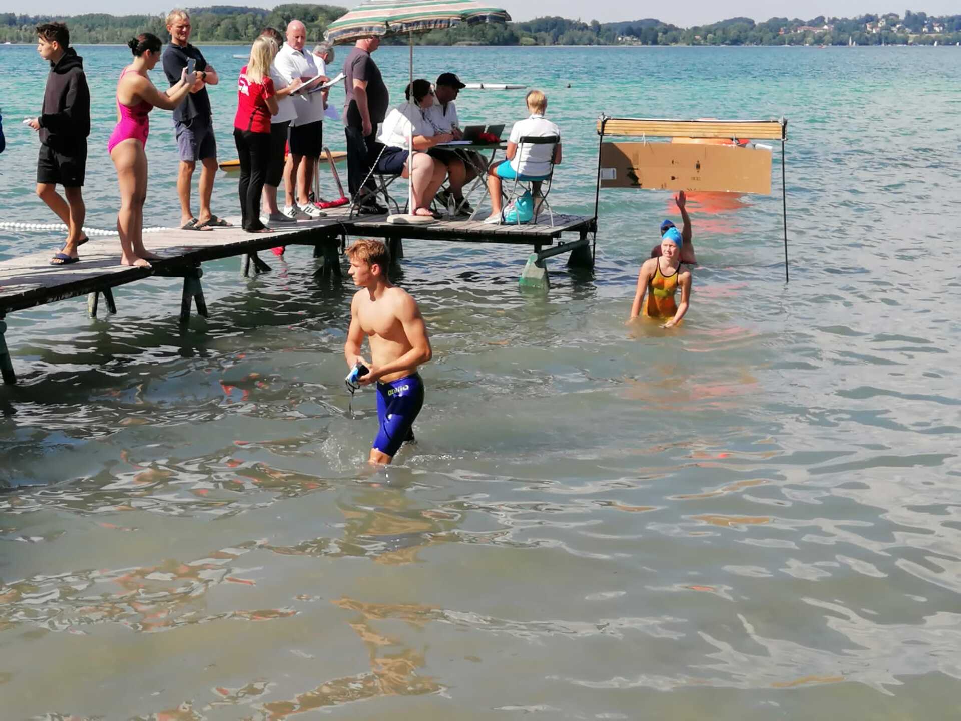 Am Wörthsee fanden in diesem Jahr im Rahmen des Internationalen Bayerncups im Freiwasserschwimmen die bayerischen Meisterschaften statt. Für fast alle Coburger ein sehr ungewohnter Wettkampf, da man ja normalerweise in Hallen- oder Freibädern seine Bahnen im Training und im Wettkampf ziehen muss. Im Freiwasser ist das ein komplett anderes Wettkampfgefühl. Ein 1250m langer Rundkurs musste im 25,5 Grad warmen Wasser z.T. mehrere Male umrundet werden. In einer Reihe stellen sich 50 oder mehr Schwimmer oder Schwimmerinnen aller Altersklassen an der Startschnur auf. Mit dem Startpfiff stürzen sich alle der ersten Boje entgegen. Meist geht das nicht ohne Schläge, Schubser oder an den Füssen gezogen zu werden von statten. Der Schwimmstil muss im Freiwasser ebenfalls angepasst werden, da man immer die Boje im Blick haben muss und es so deutlich schwerer ist eine Rhythmus zu finden.
